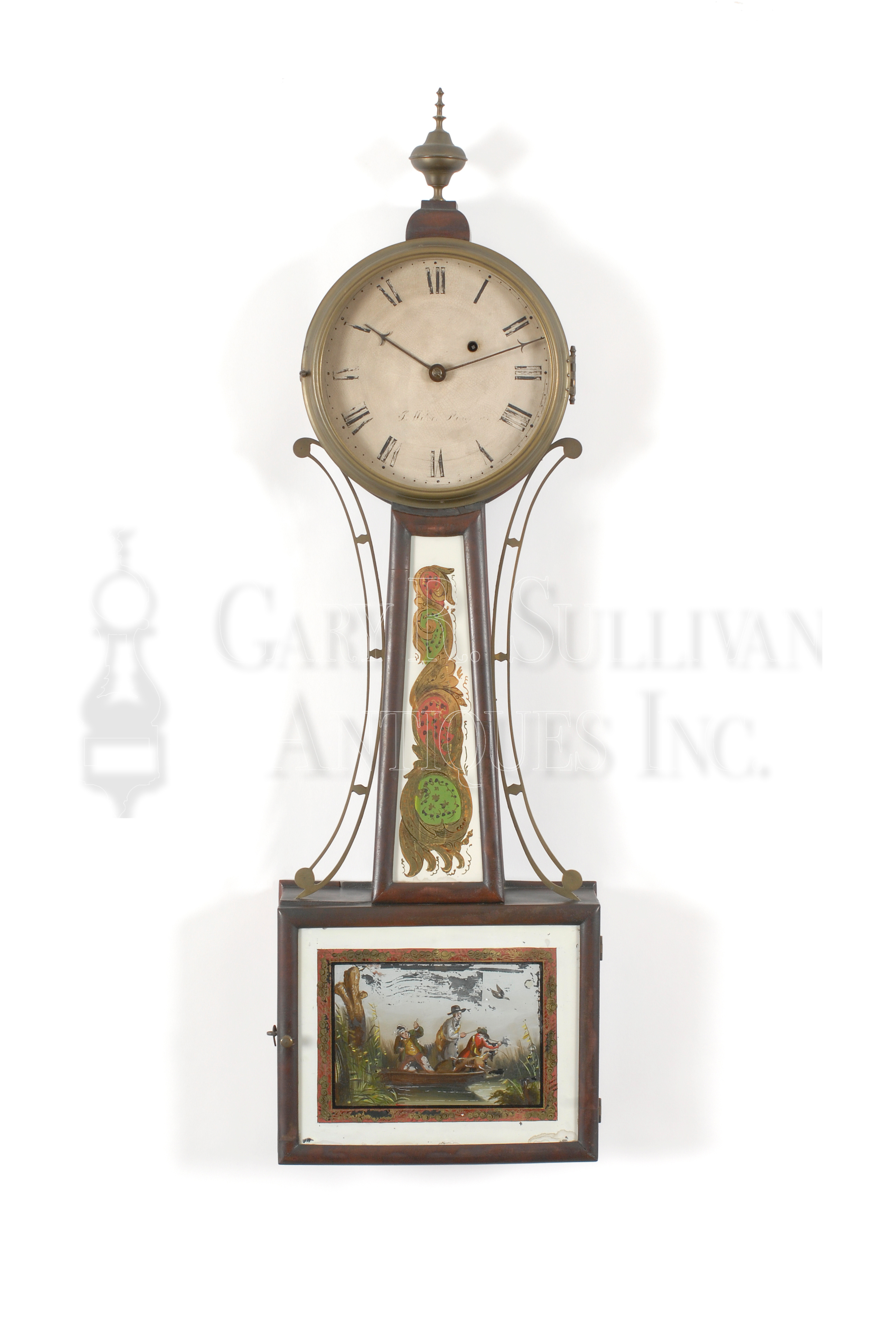 This attractive clock was produced by the famous clockmaker Joshua Wilder (1786-1860). Wilder was a primary member of an influential group of Quaker clockmakers from Hingham. This well known clock type was patented by Simon Willard in 1802 as the “Improved Timepiece” but is more commonly referred to as a “banjo” clock. Examples of banjo clocks from this area are very scarce and signed examples are even more rare. This clock is in superb original condition with a pleasing old surface with mellow color. The drum-form head is fitted with a gilt brass urn form finial on a mahogany plinth. This finial rests above a glazed and molded brass bezel. The bezel opens to a painted iron dial with Roman numerals to demark the hours. The dial, which is in original condition, is signed with the makers name and locale, “J. Wilder, Hingham”. The center arbor is mounted with the original steel arrow-form hands. A single winding hole is above and to the right of the center arbor. Pierced brass sidearms, with diamond-form spacers, flank a tapered trapezoidal throat frame with half-round moldings. The frame has a reverse painted panel decorated with gilt scrolls and green and red flourishes all on a white ground. The hinged lower box door also has half-round moldings and an eglomisé panel. This lower panel is painted with a detailed duck hunting image depicting three men and a hound in a small boat set in a marshland scene. The hinged door opens to reveal the brass capped pendulum bob with brass tie down and a black painted tin weight pan. The mahogany case sides are joined to a mahogany backboard. The brass eight-day movement has a recently been serviced and is in excellent running order. The tapered lead weight with “duck bill” hook and steel pendulum rod with brass-capped bob are original to the clock.