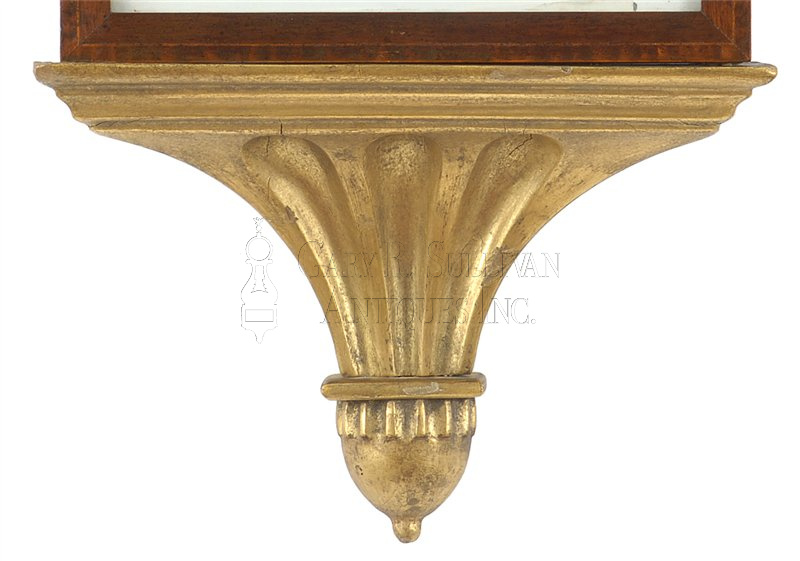 This highly important antique banjo clock is among the first generation of these patent time pieces or banjo clock produced by the innovative clockmaker Simon Willard [1753-1848] of Roxbury, Massachusetts. Examples like this, with cross-banded frames and understated geometric eglomisé panels, were made in the shops of Simon Willard during the first years of his patent, after 1802. This case has mahogany and figured maple cross-banded frames around classical white and pink glasses with gilt foliate borders. The throat glass is decorated with gilt crosshatching and the lower tablet is signed "S. Willard's Patent". The glasses are all original without any flaws. The case, which retains a fine surface and patina, has a rare gilt and carved presentation bracket. The brass eight-day movement is constructed with through-bolts and a dead beat escapement with a "T" bridge.