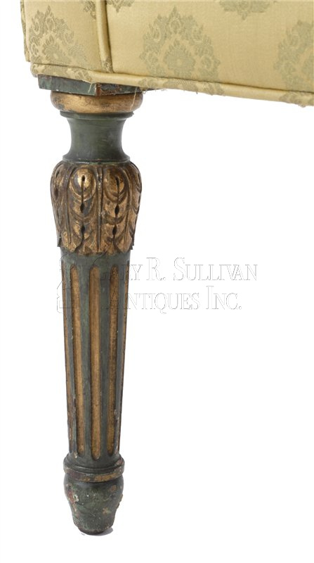 This antique barrel back easy chair demonstrates the prevailing influence of French styles in Federal America. The carved legs, which are painted green with gilt foliage and highlights, echo the Louis XVI styles fashionable at the end of the 18th century. It is acknowledged that Philadelphia produced the finest examples of these French forms of easy chairs in a number of its prominent cabinet shops. This rare antique barrel back easy chair handsomely combines the French and Sheraton tastes of the day, into a form which is uniquely American.