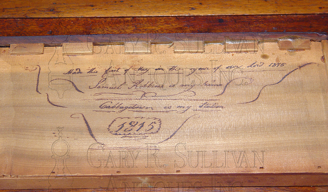 Hepplewhite walnut antique slant lid desk, made and signed by Samuel Robbins of Cabbagetown, New Jersey, dated 1815.